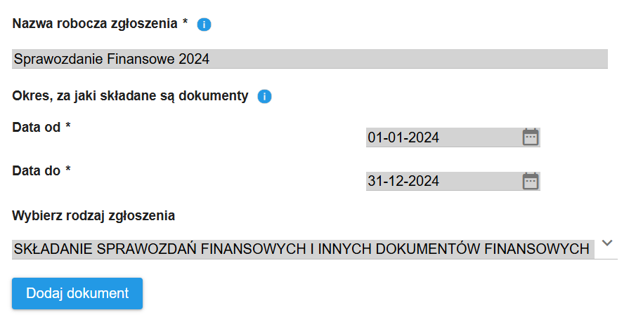 Na szarym pasku mamy miejsce na wpisanie okresu, za który będzie składane sprawozdanie, a także jego nazwy. Pod opcją „wybierz rodzaj zgłoszenia” wybieramy „składanie sprawozdań finansowych i innych dokumentów finansowych”. Następnie klikamy niebieski kafelek „dodaj dokument”.